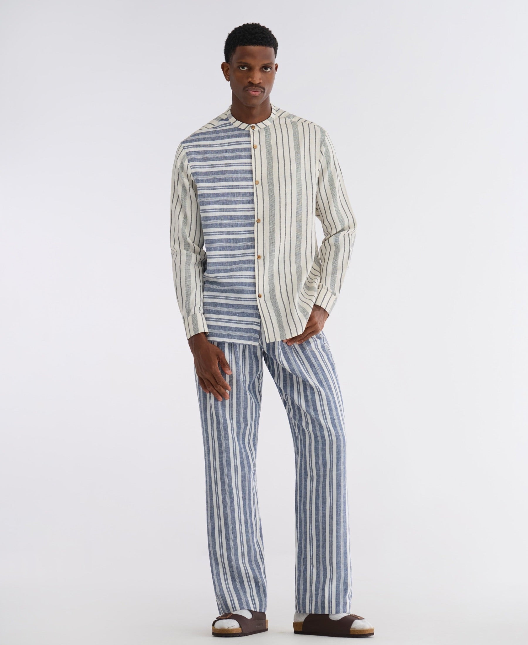 A relaxed two-piece set crafted from breathable linen, designed for ease, comfort, and everyday refinement. The long-sleeve shirt features a clean silhouette, finished with natural wooden buttons for subtle character and warmth. Paired with matching trousers, this set balances structure with softness